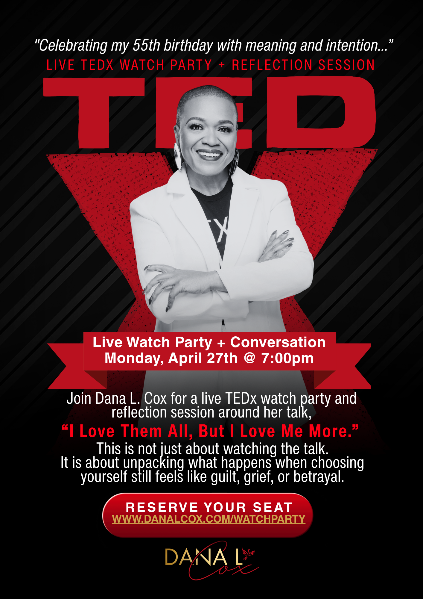 Join Dana L. Cox for a live TEDx watch party and reflection session around her talk, “I Love Them All, But I Love Me More.” This is not just about watching the talk. It is about unpacking what happens when choosing yourself still feels like guilt, grief, or betrayal.